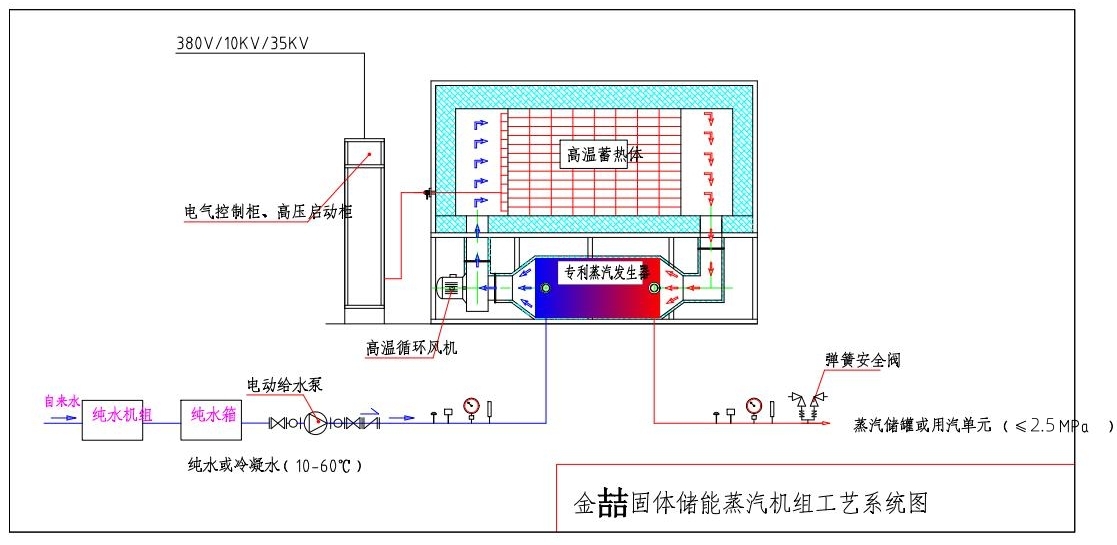 金喆新能源的固體蓄熱電蒸汽機組,是符合當下清潔能源供熱趨勢、節能環保、運行成本低30%以上的電蒸汽鍋爐。它利用谷電、風電或光電的電能將固體蓄熱體加熱到超高溫,工作時間段啟動高溫循環風機將高溫熱風送入蒸汽發生器加熱高壓柱塞泵加壓送入的軟化水,經換熱產生≤2.5MPa的高溫高壓蒸汽。